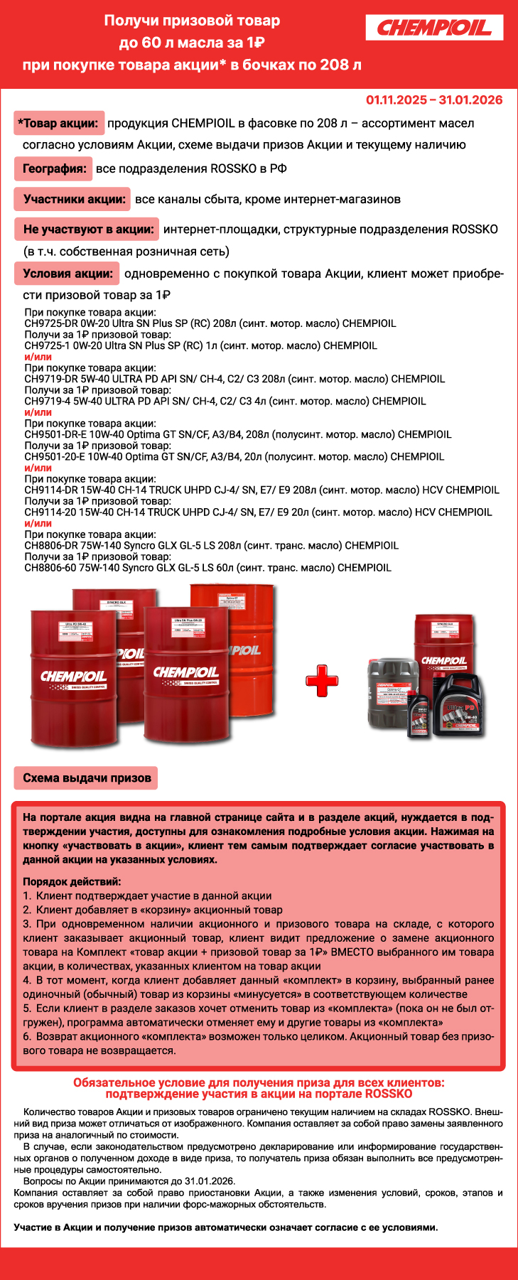 Акция «Получи призовой товар – до 60 л масла CHEMPIOIL за 1₽ – при покупке товара акции* в бочках по 208 л»